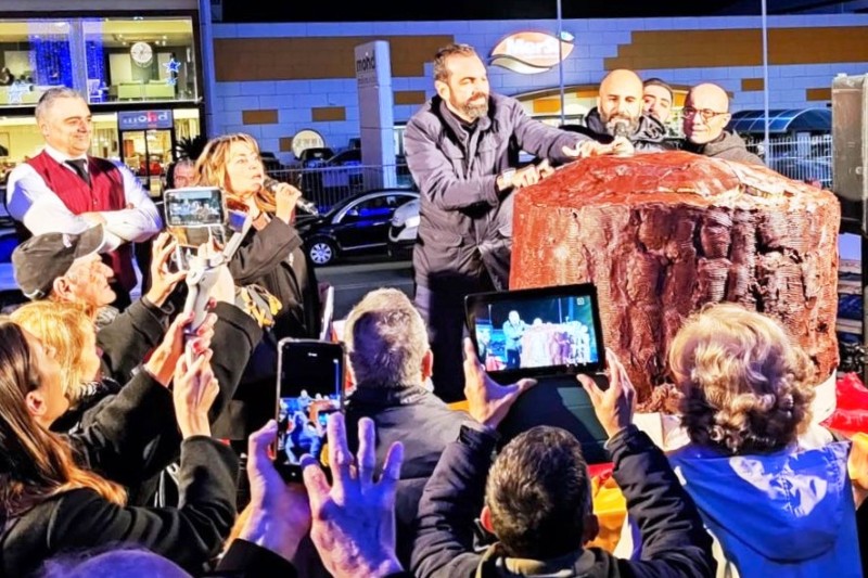 Il primo taglio del sindaco Basile è avvenuto sul palco allestito davanti all’ingresso del Centro alla presenza di numerose persone impazienti di assaggiare il grande dolce.