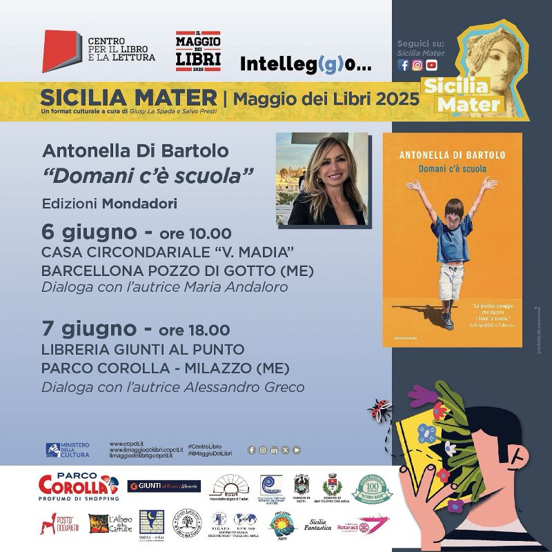 Si avvia alla chiusura il cartellone del Maggio dei libri di Sicilia Mater, rubrica culturale a cura di Giusy La Spada e Salvo Presti, seguendo il tema della XV edizione Intelleg(g)o… dunque sono. Un filone tematico dedicato alla scoperta di sé e al rapporto con il prossimo, a ferite e Ripartenze, alla riflessione e alla condivisione. Uno spazio in cui aprirsi all’intelligenza e educazione creativa, emotiva e affettiva, trovando nella lettura – dai romanzi di formazione alla poesia – lo strumento migliore contro ogni discriminazione, ogni stereotipo, ogni riduzionismo, ma anche ogni banalizzazione del “politicamente corretto”.  “Un solo insegnante può cambiare molte vite”  e “La Scuola è Luce” ama ripetere la dirigente scolastica del quartiere Sperone-Brancaccio di Palermo Antonella Di Bartolo, autrice del volume “Domani c’è scuola.  Proprio lungo queste tracce venerdì 6 giugno si muove l’incontro con i detenuti del carcere “V.Madìa” di Barcellona P.G..  Nel pomeriggio, a incontrare i ristretti presso il carcere di Messina “Gazzi”, sarà Mariagrazia Giammarinaro, autrice del romanzo “Donne di un altro mondo”,  in dialogo con Carmen Currò, Letizia Lo Giudice e Maria Gianquinto.