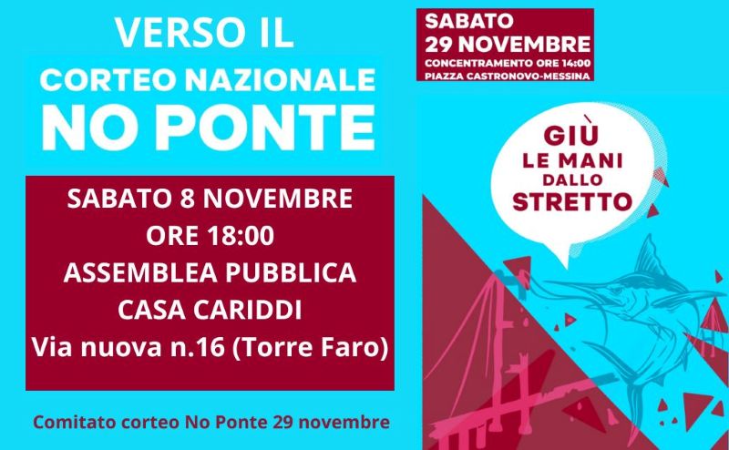 Sabato 8 Novembre alle ore 18.00 presso Casa Cariddi, ex poste di Torrefaro , si terrà la prima delle tre assemblee cittadine promosse dal Comitato del corteo noponte del 29 Novembre. Sarà l’occasione per tenere a nord, centro e sud della città quel dibattito pubblico previsto per legge per ogni grande opera pubblica e che è stato negato alla nostra città.