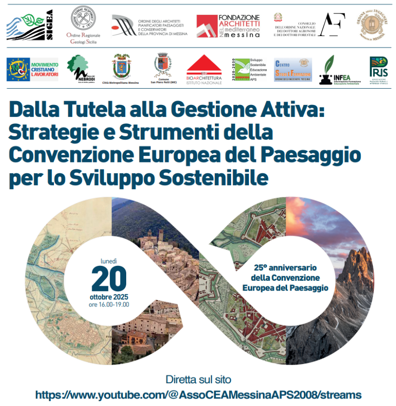 Dalla Tutela alla Gestione Attiva: Strategie e Strumenti della Convenzione Europea del Paesaggio per lo Sviluppo Sostenibile (Focus sulle politiche e la pianificazione pratica) online 20 ottobre 2025 ore 16:00 – 19:00 Seminario promosso da SIGEA-APS e coorganizzato con AssoCEA Messina APS.