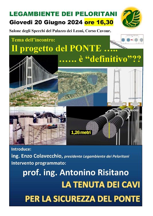 Salone degli Specchi della Città Metropolitana di Messina, Legambientedei Peloritani organizza un incontro sul Ponte sullo Stretto, sul tema”Il progetto del Ponte … è definitivo?”. Dopo una  introduzione dell’ing. Enzo Colavecchio previsto l’intervento del prof. ing. Antonino Risitano sul tema “La tenuta dei cavi per la sicurezza del Ponte”.