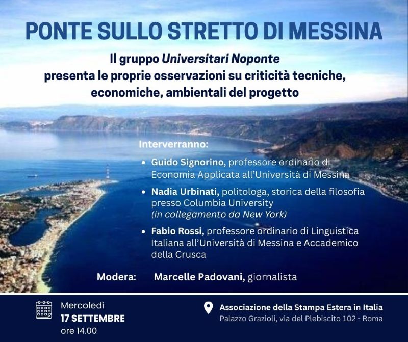 Domani pomeriggio 17 settembre a Roma, Palazzo Grazioli, gli Universitari No Ponte di Messina terranno una conferenza stampa sugli aspetti controversi del progetto