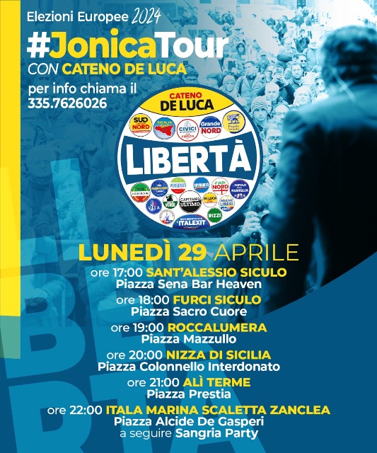 Prosegue il tour per le elezioni europee dell’8 e 9 giugno per illustrare il programma della lista Libertà. Lunedì 29 aprile il leader di Sud chiama Nord e federatore della Lista Libertà Cateno De Luca sarà a Sant’Alessio Siculo alle 17 in piazza Sena al Bar Heaven. Alle 18 appuntamento a Furci Siculo a piazza Sacro Cuore. Tappa a Roccalumera alle 19 a piazza Mazzullo per poi spostarsi alle 20 a Nizza di Sicilia in piazza Colonnello Interdonato. Alle 21 ad Alì Terme in piazza Prestia e alle 22 in piazza Alcide De Gasperi a Itala Marina-Scaletta Zanclea.