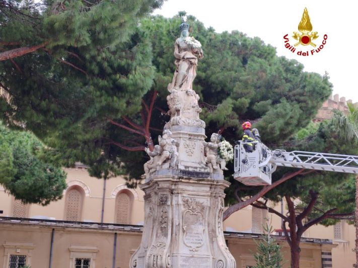 Oggi, in occasione della Festa dell’Immacolata Concezione, i Vigili del fuoco del Comando di Messina hanno reso omaggio alla Madonna con una cerimonia solenne a Piazza Duomo. Durante l’evento, una Vigile del fuoco all’interno del cestello dell’autoscala VF, ha posto una corona di fiori in cima alla statua della Madonna, simbolo di devozione e protezione per la città.