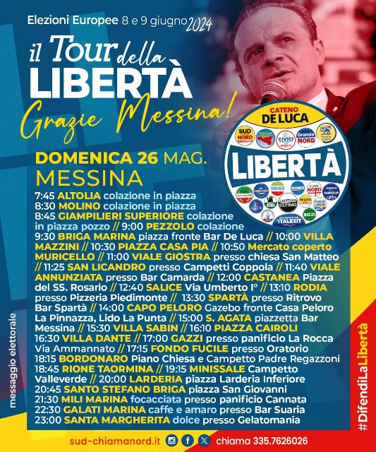 Dal centro ai villaggi, numerosi gli appuntamenti in programma per domenica 26 maggio per incontrare De Luca e conoscere il progetto della lista Libertà, pensato per le europee dell’8 e 9 giugno.