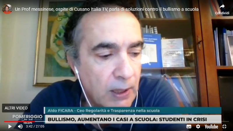 Il nove ottobre Cusano Italia TV ( canale nazionale 264 del digitale terrestre ), l’emittente televisiva di Stefano Bandecchi, ha ospitato il messinese Aldo Ficara, docente di elettrotecnica presso l’IIS Verona Trento – Majorana, per parlare del fenomeno bullismo all’interno delle scuole. La trasmissione televisiva “ Pomeriggio con noi” condotta brillantemente da Tommaso Franchi ha toccato vari aspetti sia del bullismo tra pari di quello dal basso ( aggressioni degli studenti nei confronti degli insegnanti. Recentemente in un post pubblicato sul sito Regolarità e trasparenza nella Scuola e rilanciato dalla rassegna stampa dal Provveditorato agli studi di Messina ( oggi Ufficio VII – Ambito Territoriale di Messina ) il Prof Ficara ha scritto: “ Le storie di bullismo a scuola ci raccontano di diversi tipi di bullismo che, oltre alle manifestazioni che già conosciamo, può essere: