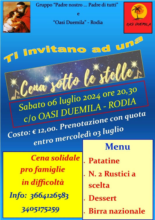 Il gruppo “Padre nostro…Padre di tutti” comunica che sabato 06 luglio 2024 alle ore 20.30 presso “Oasi Duemila” – Rodia si svolgerà una cena solidale “sotto le stelle” a beneficio del gruppo “Padre nostro … Padre di tutti” per sostenere alcune famiglie messinesi che vivono situazioni di disagio.