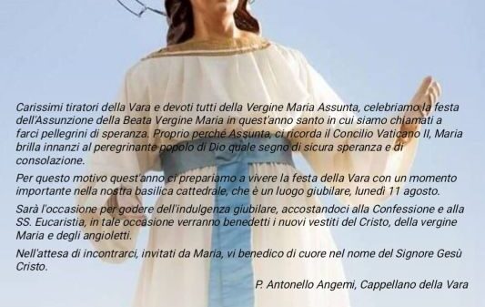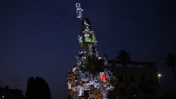 Come da programma, stamani i Giganti sono stati trasportati direttamente da Camaro Superiore in Piazza Unione Europea. Ieri sera, presso l’Auditorium del Palacultura, si è tenuta la conferenza del prof. Antonino Sarica “La Vara dalla Storia alla Gastronomia: il racconto del Cuneo e i piatti del Mezzagosto messinese”, a cura dell’Associazione “Antonello da Messina”. A seguire la cerimonia di consegna alla Mostra Permanente della Vara e dei Giganti della gigantografia fotografica della Vara del 1959 e foto sul Mezzagosto del fotografo Agostino Saya. Gli appuntamenti di oggi, sabato 13, delle iniziative promosse dall’Amministrazione comunale, nell’ambito della rassegna “La Vara di Messina. Una storia di fede lunga 500 anni” edizione 2022, dedicata a Franz Riccobono, in collaborazione con il Gruppo Storico della Vara e dei Giganti ed il contributo di Associazioni culturali, saranno i seguenti: alle ore 17, in via Garibaldi, la gara ciclistica “Trofeo Maria Assunta”; alle ore 19.30, nell’area sottostante il Sacrario di Cristo Re, Benedizione e inaugurazione del Monumento dell’Arcivescovo Mons. Angelo Paino, a cura dell’Arcidiocesi di Messina, Lipari e S. Lucia del Mela e del Coordinamento cittadino “Pro Monumento S. E. Mons. Angelo Paino”. (La Statua è dono della “Fondazione Città del Ragazzo” di Padre Nino Trovato e il progetto del Monumento è dell’ing. arch. Livio Lucà Trombetta).