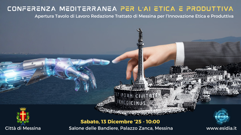 “Conferenza Mediterranea per l’AI etica e produttiva”. Messina, 13 dicembre 2025. Salone delle Bandiere, Palazzo Zanca. Il 13 dicembre alle ore 10, Messina ospiterà la Conferenza Mediterranea sull’Intelligenza Artificiale, un evento promosso da ESIDIA – Ente Siciliano per l’Innovazione Digitale e l’Intelligenza Artificiale che avrà luogo nel prestigioso Salone delle Bandiere a Palazzo Zanca e riunirà relatori d’eccezione provenienti dal mondo accademico, istituzionale, scientifico e imprenditoriale al fine di affrontare con visione e responsabilità i principali temi che stanno trasformando il nostro presente e il nostro futuro: etica e governance dell’AI, impatto sulle imprese e sulla produttività, innovazione sostenibile, formazione e competenze digitali, prospettive euro-mediterranee dell’innovazione. La Conferenza rappresenterà un momento di confronto strategico, aperto a tutti, nella quale verranno approfondite le opportunità e le sfide dell’Intelligenza Artificiale nel quadro di un modello di sviluppo etico, sostenibile e orientato al bene comune. Nel corso dell’evento sarà presentato il percorso per la redazione del “Trattato di Messina per l’Innovazione Etica e Produttiva”, un’iniziativa che punta a costruire un modello consapevole condiviso di sviluppo tecnologico fondato sull’equilibrio tra coscienza e conoscenza e di sviluppo di una rete di produttività. Il Trattato nascerà attraverso un processo partecipativo e di rete. Nel corso della Conferenza verrà istituito il Tavolo di Lavoro, aperto a imprese, istituzioni, università, organizzazioni culturali e sociali, pubblica amministrazione, professionisti ed esperti del settore, con l’obiettivo, il linea con le regolamentazioni esistenti, di elaborare principi, proposte operative e linee guida che ne costituiranno il testo ufficiale. La Conferenza si svolgerà con il Patrocinio ufficiale del Comune di Messina. A conferire ulteriore valore all’evento sarà la partecipazione istituzionale del Sindaco di Messina, Federico Basile e dell’Assessore all’Innovazione Roberto Cicala che interverranno per portare il saluto della Città e sottolineare il costante impegno dell’Amministrazione Comunale nel programmare e sostenere percorsi di innovazione responsabile e particolarmente attenta alla giusta ed inclusiva diffusione della cultura del digitale. Di rilevanza e prestigio anche la presenza del Vice Presidente di Sicindustra Dott. Giuseppe Lupò e del Prof. Massimo Villari, Ordinario di Informatica dell’Università degli Studi di Messina. Tra i relatori il panel prevede la presenza di massimi esperti di AI in ambito specialistico ed etico. L’evento si inserisce, in modo simbolico, nel solco della tradizione culturale e civile della Città dello Stretto, già sede proprio settant’anni fa, nel 1955, del confronto politico che diede impulso al percorso di integrazione europea. Messina torna a essere luogo di dialogo e innovazione con un evento che unisce la sua identità mediterranea ad una visione futuristica ed inclusiva e la Sicilia nella sua centralità, laboratorio di innovazione e tavolo di lavoro permanente sulle nuove tecnologie.
