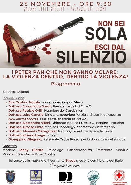 Lunedì 25 novembre 2024, ore 9:30 nel Salone degli Specchi di Palazzo dei Leoni, si svolgerà l’incontro dal titolo “Non sei sola, esci dal silenzio. I Peter Pan che non sanno volare: la violenza dentro, dentro la violenza!”, organizzato dalla Croce Rossa Italiana – Comitato di Messina, in sinergia con la VII Direzione “Servizio Cultura” e con il Comitato Unico di Garanzia della Città Metropolitana di Messina, in occasione della Giornata internazionale contro la violenza sulle donne.