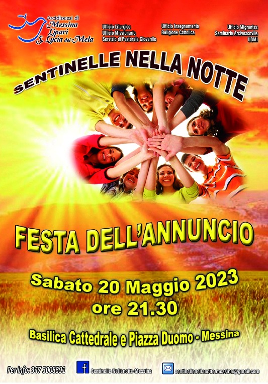 Sabato 20 maggio, dalle ore 21.30 alle ore 24.00, nella Basilica Cattedrale di Messina, nell’ambito del progetto pastorale “Sentinelle nella notte”, l’Ufficio Liturgico, l’ Ufficio Migrantes, l’Ufficio Missionario, l’Ufficio Insegnamento Religione Cattolica, la Pastorale Giovanile, il Seminario Arcivescovile e l’USMI propongono LA FESTA DELL’ANNUNCIO, evento che tende a coinvolgere parrocchie, movimenti, associazioni e istituti religiosi per vivere un’esperienza forte di preghiera ed evangelizzazione nel cuore della nostra città.