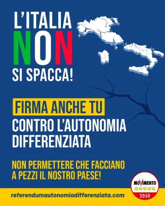 Il Movimento 5 Stelle è presente nel comitato promotore del Referendum di abrogazione della Legge sull’Autonomia differenziata. Entro il 30 settembre andranno depositate almeno 500mila firme.