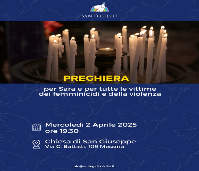 Per questo la Comunità di Sant’Egidio invita a pregare per Sara, e per tutte le donne vittime di femminicidio e di ogni forma di violenza.Mercoledì 2 aprile 2025, alle ore 19:30, presso la Chiesa di San Giuseppe, Via C. Battisti, 109 – Messina.