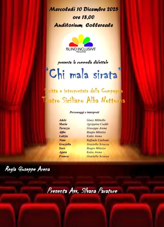 portera’ in scena la commedia dialettale “Chi mala sirata”. L’evento ad ingresso libero volto a far vivere un momento di leggerezza, di sorrisi, è promosso dall’associazione Messina Blind Inclusive che, come dichiarato dal suo presidente Raffaele Carbone, ha come obiettivo quello di utilizzare l’arte e lo spettacolo per favorire l’eliminazione delle “barriere architettoniche”.