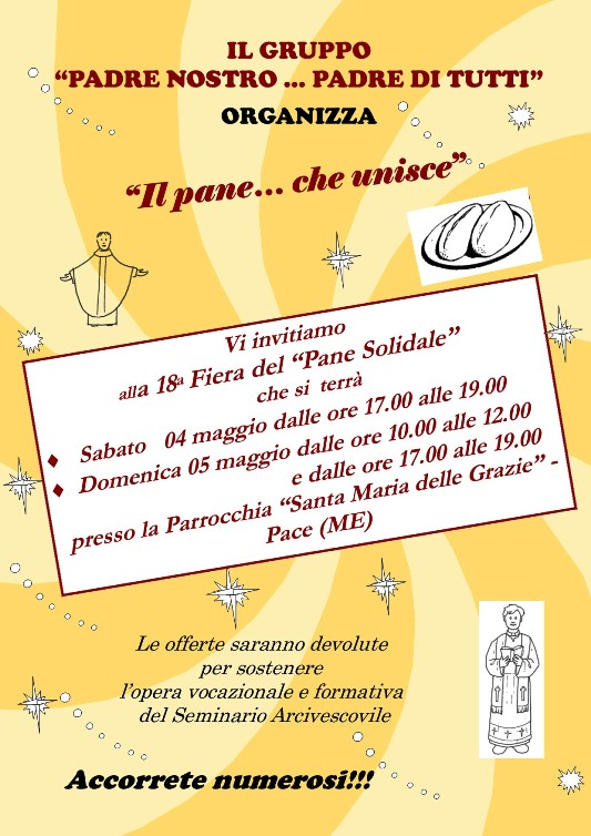 Sabato 04 maggio dalle ore 17.00 alle ore 19.00 e domenica 05 maggio dalle ore 10.00 alle 12.00 e dalle ore 17.00 alle 19.00 presso la parrocchia “Santa Maria delle Grazie” Pace (Messina), il gruppo “Padre nostro … Padre di tutti” organizza, la 18a Fiera del “Pane Solidale”. Le offerte saranno devolute per sostenere l’opera vocazionale e formativa del Seminario Arcivescovile “San Pio X”.