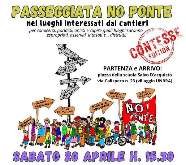 L’estate che viene sarà un’altra estate di lotta e se davvero dovessero essere avviati i cantieri saranno quelli i luoghi in cui porteremo la nostra opposizione. I prossimi giorni saranno, invece, dedicati a creare eventi di discussione e mobilitazione sui luoghi che più fortemente sarebbero coinvolti nel processo di devastazione cui verrà sottoposta la città. Sabato 20 Aprile saremo a Villaggio UNRRA e Contesse per una passeggiata no ponte, con concentramento nella piazza della Scuola Salvo D’Acquisto, Via Calispera n° 23, alle ore 15:30, con l’obbiettivo di manifestare contro la prosecuzione dell’iter del ponte e aprire una discussione pubblica in un contesto che sarebbe quello che dopo la zona di Faro/Ganzirri sarebbe la più colpita dai cantieri.