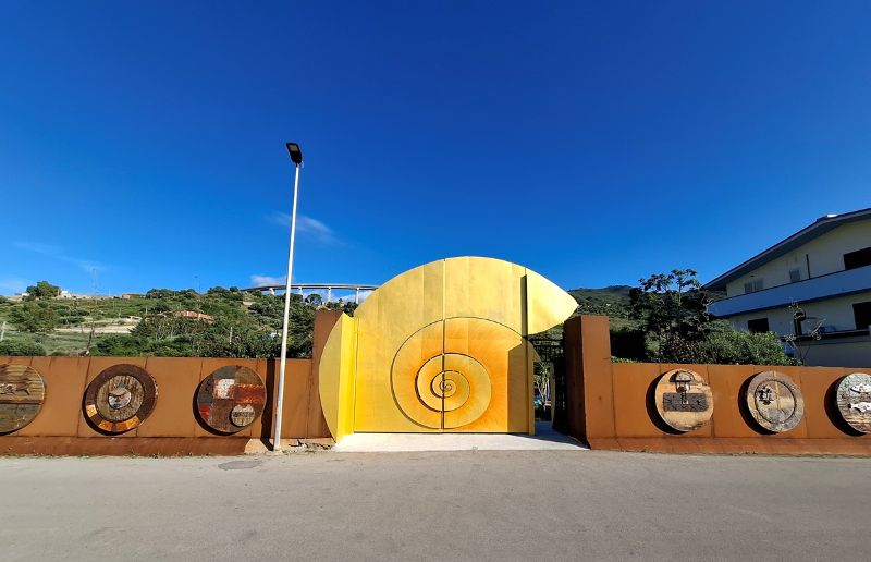 A cingerla, le robuste mura in cui campeggiano sei scudi dedicati a Giusto Sucato, realizzati dal figlio Pablo insieme a Noyà. Mura chiuse dall’ammonite dorata che «rappresenta – osserva l’artista belga di origini italiane Noyà – il ritorno a quel legame con la natura che rischiamo di perdere e che invece abbiamo l’urgenza di recuperare».