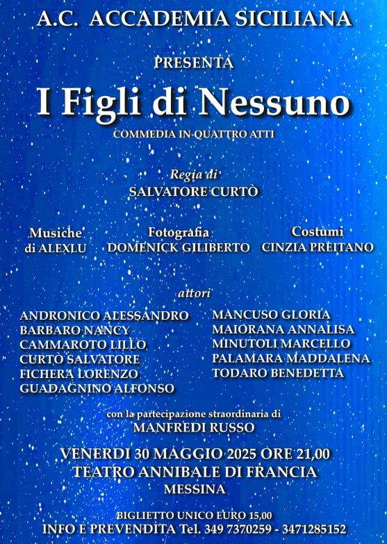 Messina – Manca davvero pochissimo alla rappresentazione della commedia in quattro atti dal titolo “I Figli di Nessuno”, che andrà in scena al teatro Annibale Maria di Francia venerdì 30 maggio alle 21. Lo spettacolo, promosso dall’associazione culturale “Accademia Siciliana”, è liberamente tratto dall’omonimo romanzo di Salvatore Curtò e ha ottenuto ben cinque premi internazionali e oltre venti riconoscimenti minori. Curtò, che dopo tanto tempo ritorna a teatro anche come interprete, ha riadattato il testo per la commedia firmandone anche la regia. La rappresentazione teatrale si avvarrà della partecipazione straordinaria di Manfredi Russo, che ha un curriculum di tutto rispetto, interpretando non solo ruoli drammatici e impegnati, ma anche commedie molto divertenti. Da ricordare anche la sua partecipazione a diversi film, tra i quali “Mario Francese” trasmesso da canale 5, “Paolo Borsellino i 57 giorni” film prodotti dalla Rai, “Squadra Antimafia 4” su reti Mediaset, e per il grande schermo “L’ora Legale”. Nel cast anche il giovane talento siciliano Alfonso Guadagnino; Alessandro Andronico; Nancy Barbaro; Lillo Cammaroto, Lorenzo Fichera; Gloria Mancuso; Annalisa Maiorana; Marcello Minutoli, Maddalena Palamara; Benedetta Todaro. Una commedia brillante ma allo stesso tempo impegnativa per i temi trattati che ha come protagonista Totò Messina che incarna l’antitesi di Totò Riina, suo coetaneo e conterraneo, ma anche il suo acerrimo nemico. Uno salva vite umane, l’altro ordina stragi; uno combatte la fame con il lavoro, l’altro la vince a scariche di mitra; uno ha molte donne, l’altro, forse per unica virtù, è fedele all’unica donna della sua vita. La commedia girerà la Sicilia facendo tappa anche a Catania, Palermo, Caltanissetta ea dicembre approderà ad Agrigento. Biglietto unico 15 euro; informazioni al 3497370259 o al 3471285152