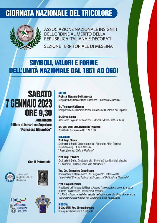 L’evento con cui sarà celebrato il 226°Anniversario della Nascita della Bandiera italiana è  promosso dall’ A. N. I. O. M. R. I. D (Associazione Nazionale Insigniti dell’Ordine al Merito della Repubblica Italiana e Decorati) sezione territoriale di Messina col patrocinio dell’Università degli Studi di Messina, dell’Istituto del Nastro Azzurro fra combattenti decorati al valor militare – Federazione Provinciale di Messina, ed è coordinato e sarà moderato dal consigliere nazionale A.N I. O. M. R. I. D. Cav. OMRI Avv. Silvana Paratore.