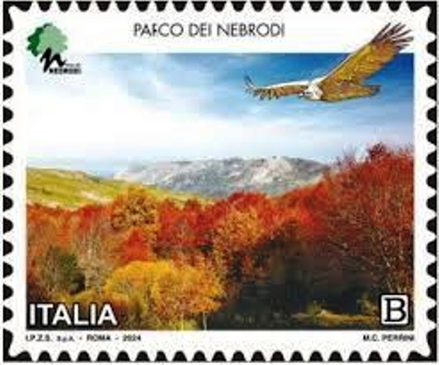 “Le Rocche del Castro viste dalla Faggeta di Monte Soro, in cui volteggia, in alto a destra, un grifone” è l’immagine scelta per il francobollo dedicato al Parco dei Nebrodi,