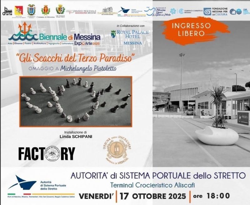 Continua senza sosta il dialogo virtuoso tra le opere e i palazzi Istituzionali della città, grazie all’ambizioso progetto nato attraverso la I Biennale d’Arte di Messina. A promuoverla Gianfranco Pistorio e Stefania Arcidiacono, rispettivamente presidente e vicepresidente dell’importante manifestazione artistica e culturale che ha dato vita a un palcoscenico diffuso. Domani (venerdì 17) la Biennale d’Arte aprirà ai visitatori altri due luoghi simbolo della città: il Terminal Crocieristico e Aliscafi dell’Autorità di Sistema Portuale dello Stretto, con inaugurazione alle 18, e il palazzo della Dogana, con inaugurazione alle 19 (ingresso libero). Al taglio del nastro saranno presenti, oltre a Gianfranco Pistorio e Stefania Arcidiacono, il sindaco Federico Basile; l’assessore alla Cultura Enzo Caruso; il commissario Straordinario dell’Autorità di Sistema Portuale dello Stretto, Francesco Rizzo; il direttore dell’Ufficio delle Dogane, Claudio Tucci; la madrina della manifestazione Letizia Lucca. Al Terminal Croceristico e Aliscafi sarà possibile ammirare “Gli Scacchi del Terzo Paradiso”, installazione di Linda Schipani dedicata al Terzo Paradiso dell’artista, pittore e scultore Michelangelo Pistoletto, con il patrocinio dell’Ordine degli Ingegneri. Nell’installazione – realizzata con la tecnica dell’assemblaggio di plafoniere stradali dismesse – il primo cerchio, delimitato dagli scacchi bianchi, rappresenta la Natura o la Pace, il secondo cerchio, formato da scacchi neri, rappresenta l’artificio o la guerra, il terzo cerchio, centrale e più grande, accoglie scacchi bianchi e neri per rappresentare la condivisione, l’accoglienza, la tolleranza, la sostenibilità e l’equilibrio nelle differenze. Al palazzo della Dogana, si terrà l’inaugurazione dell’installazione “Il fervore dei mercanti”, commissionata dalla presidenza della Biennale d’Arte, ideata e progettata dagli architetti Michele Palamara e Antonio Ciancio. A realizzarla gli studenti, a indirizzo “scenografia” e “architettura e ambiente”, del Liceo Artistico “Ernesto Basile”, di cui è dirigente scolastica Caterina Celesti, con il contributo del prof. Carmelo Geraci e il patrocinio gratuito della Fondazione Taormina Arte Sicilia. L’installazione intende offrire al visitatore l’emozione di rivivere il fervore del porto di Messina durante i secoli degli intensi traffici commerciali nel Mediterraneo ed è fruibile domani, dalle 19 alle 21, e nei giorni 18, 20, 21, 22, 23, 24, 25, dalle 9 alle 13.