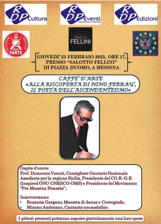 Oggi, giovedì 23 Febbraio 2023, alle ore 17, presso il suggestivo “Salotto Fellini” di Piazza Duomo, a Messina, si terrà il Caffè d’Arte mensile intitolato “Alla riscoperta di Nino Ferraù, il poeta dell’ascendenteismo”.