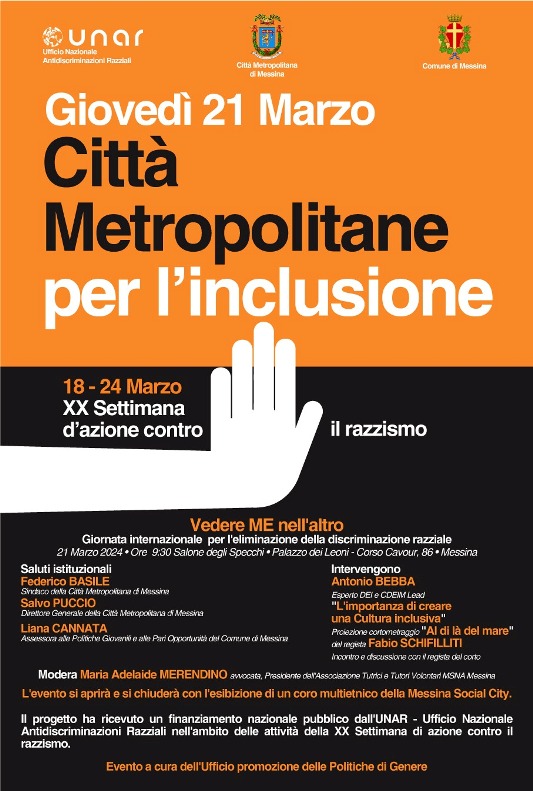 Si svolgerà domani 21 marzo 2024, ore 9:30, nel Salone degli Specchi di Palazzo dei Leoni, il convegno “Vedere ME nell’altro – Giornata internazionale per l’eliminazione della discriminazione razziale”, curato dall’Ufficio Promozione delle Politiche di Genere della Città Metropolitana di Messina, nell’ambito del progetto dell’Ufficio Nazionale Antidiscriminazioni Razziali (UNAR).
