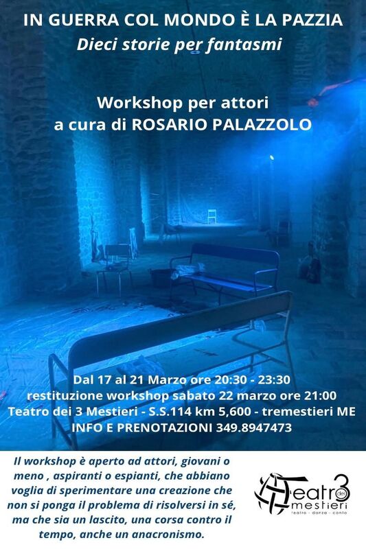 Palazzolo ha immaginato un workshop di “creazione per attori a partire da ciò che significa pazzia, o l’essere pazzi, o essere considerati pazzi, o considerarsi pazzi, e procedere per tentativi di vita che abbiano il vanto di non determinarsi mai in un discorso finito, e che anzi abbiano fatto voto di vastità, onorando tutte le molte possibilità possibili, fino alle impossibilità. E insieme alla pazzia, i fantasmi. Di cui è piena la realtà degli squilibrati, i fantasmi zoppi e ciechi, che hanno smesso di spaventare ma che lo stesso si aggirano rumorosi ovunque si possa, i fantasmi striscianti dalla coscienza lucente, i fantasmi ipocriti e malandrini che fanno sempre ciò che non va fatto, e mai ciò che è convenuto”.