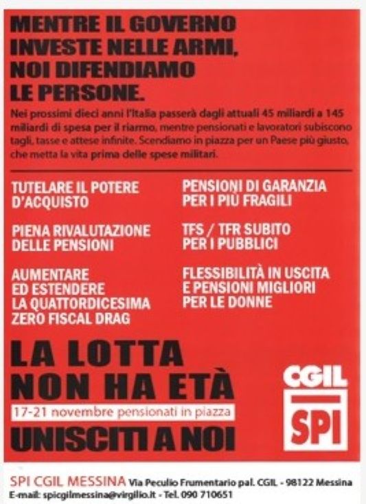 Nell’ambito della campagna nazionale dello SPI CGIL “La lotta non ha età – Unisciti a noi”, anche le pensionate e i pensionati dello SPI CGIL di Messina non si rassegnano all’ingiustizia e all’indifferenza, promuovendo una settimana di mobilitazione dal 17 al 21 novembre per difendere il diritto alla salute, alla dignità, al futuro.