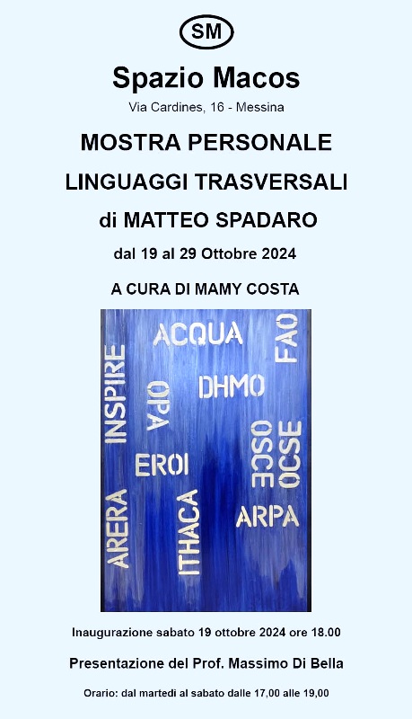 Sabato 19 ottobre, alle ore 18.00, a Spazio Macos, Via Cardines, 16, si inaugura la Mostra Personale di Matteo Spadaro, che vive e lavora a Messina, dal titolo “Linguaggi Trasversali” curata dalla d.ssa Mamy Costa anche nell’allestimento e presentata dal Prof. Massimo Di Bella che, in un passo della presentazione, spiega:“Le opere di MATTEO SPADARO si annodanoperfettamente con un linguaggio DADA che mira congrande forza ad una denuncia sociale e culturale, alloracome oggi, in uno scenario di grande attualità, che sipalesa in una amara consapevolezza e cioè l’incomunicabilità che inevitabilmente portaall’indifferenza o allo scontro. Le tele di SPADARO diventano, negli occhi del fruitore, laconcretezza di un’incomprensibile realtà fatta diincertezze e incomprensioni e spesso di fraintendimenti,come nelle metasemantica del poeta FOSCO MARAINI incui il suono delle parole all’interno del testo o della frase, spesso identifica un arbitrario significato, questi sono inuovi linguaggi trasversali della comunicazione contemporanea. Una presa di coscienza e un valore più nobile però, si nascondono nella formula artistica di SPADARO, un“gioco” che mette in ridicolo l’osservatore che spera di alzare la mano per rispondere alle mute domande che leopere presentano, ma in realtà, alzare la mano significa comprendere pienamente l’incomunicabilità sociale,sottolineata dagli orrori delle guerre, conseguenza dellelotte di potere in cui anche l’arte unico simbolo estrumento di comunicazione e di linguaggio universale,soccombe e muore. L’arte deve mutare la sua forma, adattarsi a nuovicontenitori, ma ritornare ad una sostanza primigenia, in cuiè possibile riconoscere i valori intellettuali e culturali.Le opere di MATTEO SPADARO risuonano come l’ ”Otium”di SENECA, un momento un cui fermarsi a riflettere emeditare in uno stato contemplativo ed essere in dialogocon se stessi ed il mondo.”Seguirà momento conviviale con piccolo buffet.All’ artista sarà consegnato, a fine mostra, attestato di partecipazione e di merito . La mostra è visitabile dal martedial sabato dalle 17.00 alle 19.00.