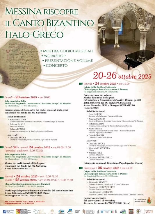 Venerdì 24 ottobre ore 16-18,30 e il 25 ottobre ore 9-12,30 e 16-18 nella Chiesa Santissima Annunziata dei Catalani ci sarà il workshop Kalophonia dedicato allo studio del canto bizantino a cura di Gerasimos Papadopoulos (Atene) e Giuseppe Sanfratello (Catania).