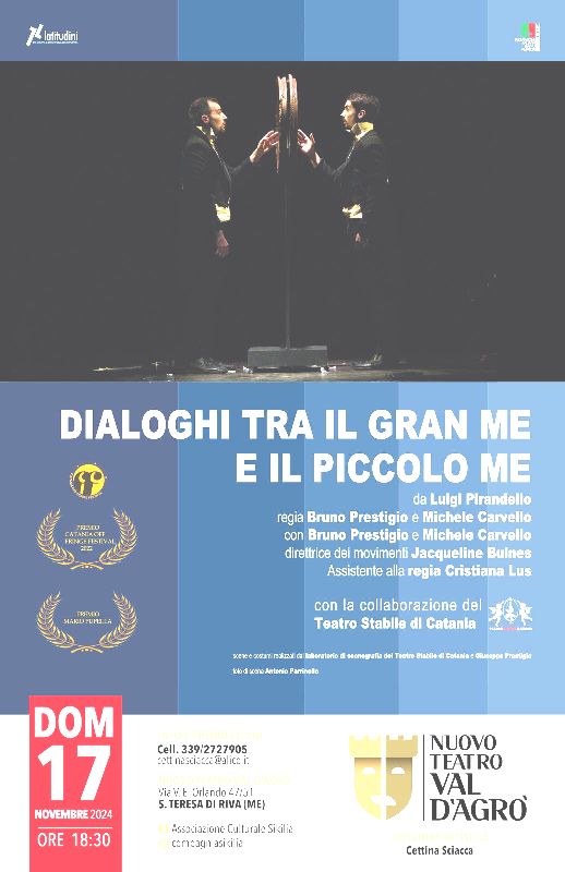 Il prossimo evento in programma è per domenica 17 novembre alle 18.30 con lo spettacolo “Dialoghi tra il grande me e il piccolo me” (Produzione Teatro Stabile di Catania), tratto da alcune novelle scritte da un giovanissimo Luigi Pirandello tra la fine del 1800 e i primi del 1900. In scena Bruno Prestigio e Michele Carvello, che ne curano anche la regia, che hanno voluto dare vita ad un testo teatrale capace di portare in scena una sensazione che ogni essere umano vive: quella del bivio.