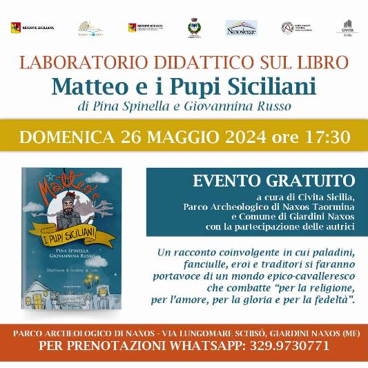 Lo scopriremo domenica 26 maggio, con il laboratorio didattico dedicato al libro “Matteo e i pupi siciliani” (Algra Editore), scritto da Pina Spinella e Giovannina Russo e con le bellissime illustrazioni di Geraldine de Leòn. Un progetto di Civita Sicilia, in collaborazione con il Parco archeologico Naxos Taormina e con l’Archeoclub di Giardini Naxos, Taormina e Valle dell’Alcantara.