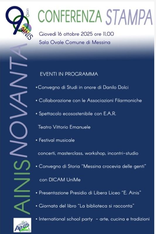 Nel corso del corrente anno scolastico ricorre il novantesimo anniversario della fondazione dell’Istituto “E. Ainis” di Messina. Per celebrare questa importante ricorrenza, il Liceo, guidato dal Dirigente Scolastico Prof.ssa Alessandra Minniti, promuoverà, nel corso dell’anno, eventi di particolare rilievo culturale che coinvolgeranno le più importanti Istituzioni cittadine come Università, Conservatorio, Ente Teatro Vittorio Emanuele. Pertanto, giovedì 16 ottobre alle ore 11:00 presso la Sala Ovale del Comune di Messina si terrà una conferenza stampa per presentare alla cittadinanza l’articolazione di queste iniziate culturali e delle relative collaborazioni. È nostro vivo desiderio averVi alla conferenza stampa. Il programma delle iniziative include: • Convegno di Studi in onore di Danilo Dolci In ricordo dell’importante figura, oltre 60 docenti provenienti da tutte le scuole della città Metropolitana di Messina faranno un’esperienza di struttura maieutica reciproca, grazie all’apporto di molteplici esperti nei campi dell’educazione, della vita dei territori, del paesaggio e dell’ ambiente provenienti da tutta Italia. • Collaborazione con le Associazioni Filarmoniche Prosecuzione delle partnership con le Associazioni Concertistiche della città di Messina che, in sinergia con il corpo docente del nostro Liceo Musicale, offrono ai nostri allievi l’opportunità di vivere prestigiose esperienze formative sia in qualità di fruitori che di protagonisti. Il primo momento di questa collaborazione sarà un bellissimo concerto tra jazz e opera in cui i nostri alunni avranno il privilegio di suonare con il famoso trombettista Fabrizio Bosso. • Spettacolo ecosostenibile con E.A.R. – Teatro Vittorio Emanuele Rappresentazione teatrale a cura degli studenti liceali nell’ambito del progetto “Go-On – il talent senza confini”, nato allo scopo di incentivare i giovani nella creazione di soluzioni che mettano in pratica alcuni dei 17 Obiettivi di Sviluppo Sostenibile dell’Agenda 2030 delle Nazioni Unite. Gli studenti applicheranno il loro talento e la loro creatività, con attività di recupero, (ri)utilizzo e trasformazione di materie prime seconde o con l’utilizzo prevalente di materiali biobased. L’E.A.R. Teatro Vittorio Emanuele supporterà i «cantieri creativi» rigorosamente sostenibili, l’ideazione e la realizzazione di soluzioni innovative e sostenibili, in un’ottica di economia circolare. • Festival Musicale Evento che integra concerti, workshop, incontri-studio e masterclass. Vetrina per musicisti emergenti con spazi dedicati a giovani talenti dal classico al contemporaneo, dal jazz al rock garantendo una varietà di esperienze d’ascolto. Sessioni interattive: lezioni pratiche e intensive focalizzate su tecniche strumentali specifiche, canto, improvvisazione, produzione. Conferenze e Seminari: momenti dedicati all’analisi, alla storia e alla teoria musicale. Tavole Rotonde e Dibattiti: occasioni per confrontarsi con esperti del settore (musicologi, critici, direttori d’orchestra, producer) sulle tendenze attuali e le sfide future dell’industria musicale. Si configura come un luogo di incontro, scambio e crescita per musicisti, studenti e appassionati, creando una comunità dove l’amore per la musica viene celebrato e approfondito sotto ogni aspetto. • Convegno di Storia “Messina crocevia delle genti” con DICAM UniMe I migliori storici del nostro Ateneo e altri specialisti guarderanno alla storia di Messina come luogo di accoglienza e di radicamento di comunità straniere che hanno fornito un contributo economico, culturale, religioso e linguistico nel corso dei secoli. • Inaugurazione Presidio di Libera Liceo “E. Ainis” intitolato a Ignazio Aloisi Inaugurazione del Presidio Scolastico di Libera presso la sede del Liceo “E. Ainis” dedicato alla memoria di Ignazio Aloisi, guardia giurata ucciso dalla mafia messinese nel gennaio 1991 ancora in attesa di giustizia. Per trasformare il ricordo in impegno civile, costruire giustizia sociale e proseguire nell’avvio di percorsi formativi che mirano a custodire e diffondere la memoria delle vittime di mafia e della criminalità organizzata. • Giornata del libro “La Biblioteca si racconta…” Apertura straordinaria al pubblico della Biblioteca dell’Istituto che conta oltre 10.000 volumi, e l’organizzazione di una Giornata del Libro dal titolo: “La Biblioteca si racconta: tesori e voci del nostro patrimonio librario”. Letture pubbliche tematiche: sessioni curate di lettura ad alta voce volte ad esplorare la diversità e la profondità dei testi custoditi. Evento che rappresenta un’occasione privilegiata per celebrare il valore della lettura e per ribadire il ruolo centrale della biblioteca come polo culturale e archivio del sapere. • International School Party – arte, cucina e tradizioni Evento interculturale che mira a consolidare i legami internazionali e a promuovere un proficuo scambio di esperienze e opinioni tra gli studenti stranieri e non, frequentanti il nostro Istituto, e i partecipanti alle mobilità Erasmus, con focus sulle tradizioni culturali, gastronomiche e artistiche dei rispettivi Paesi coinvolti.