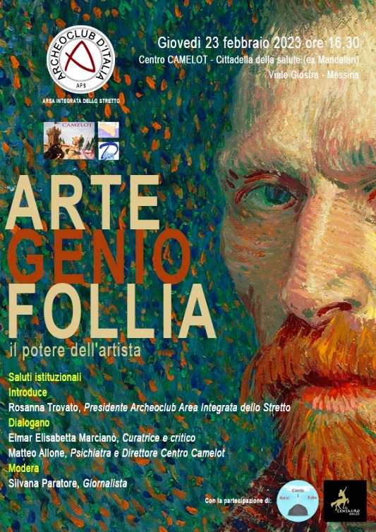 Giovedì 23 febbraio 2023 alle ore 16.30 presso il Centro Camelot – Cittadella della salute (ex Ospedale Mandalari) Viale Giostra Messina – si terrà il convegno “ARTE, GENIO, FOLLIA Il Potere dell’Artista”, organizzato da Archeoclub d’Italia Area Integrata dello Stretto, presieduto dalla Dott.ssa Rosanna Trovato.