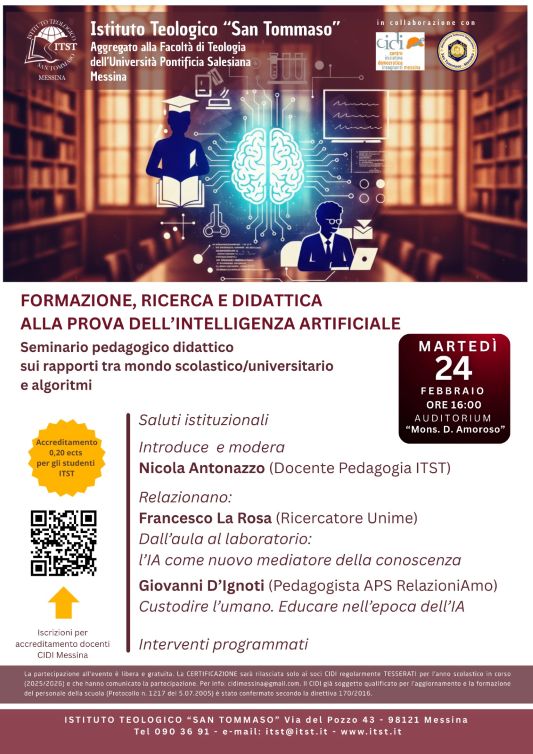 Formazione, ricerca e didattica alla prova dell’intelligenza artificiale Istituto San Tommaso – 24.02.2026 Il Centro Iniziativa Democratica Insegnanti di Messina (CIDI), in collaborazione con l’Istituto Teologico San Tommaso e l’Associazione Salesiani Cooperatori organizza, martedì 24 febbraio 2026 alle ore 16:00, presso l’Istituto Teologico San Tommaso di Via del Pozzo, un Seminario di studi dal titolo: Formazione, ricerca e didattica alla prova dell’intelligenza artificiale. Il seminario, di carattere pedagogico-didattico, approfondirà i rapporti sempre più complessi tra lo studio scolastico/universitario e il ruolo degli algoritmi che ormai operano all’interno di tutte le istituzioni formative. Dopo i saluti iniziali del Direttore dell’Istituto Teologico, prof. Don Giovanni Russo, ad introdurre i lavori sarà il prof. Nicola Antonazzo, Docente di Pedagogia generale presso lo stesso Istituto. A seguire, gli interventi del prof. Francesco La Rosa, ricercatore Unime e del dott. Giovanni D’Ignoti, Pedagogista APS RelazioniAmo. I lavori del seminario proseguiranno con gli interventi programmati e le domande dei docenti e degli studenti invitati a partecipare.