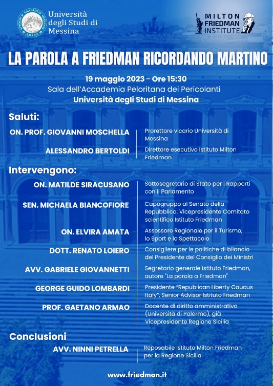 Si terrà il prossimo venerdì 19 maggio, alle ore 15.30, presso la sala dell’Accademia Peloritana dei Pericolanti, dell’Università degli Studi di Messina, il convegno dal titolo, “La parola a Friedman ricordando Martino”, organizzato dall’Istituto Milton Friedman. Nel corso del consesso si ricorderà – la figura di Antonio Martino, ex Ministro degli Affari Esteri e della Difesa, Presidente onorario dell’Istituto Friedman, liberale per eccellenza, proprio nella sua città e nella sua Università, di cui il padre Gaetano fu anche Rettore per oltre 10 anni – e della sua amicizia con il premio Nobel per l’economia, Milton Fridman.