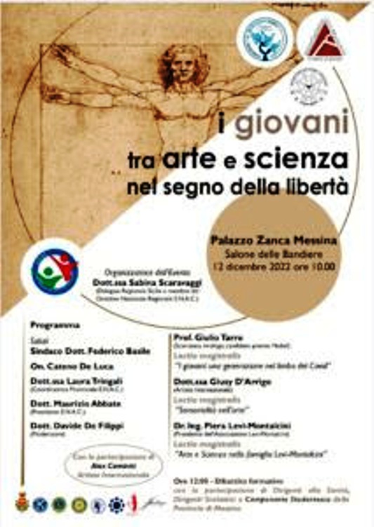 “I giovani tra Arte e Scienza nel segno della libertà” è il titolo del Convegno che si terrà lunedì 12, alle ore 10, nel Salone delle Bandiere a Palazzo Zanca. L’evento, organizzato dalla dott.ssa Sabina Scaravaggi, delegata regionale Sicilia e membro nazionale E.N.A.C., Ente Nazionale Attività Culturali, ente di promozione sociale, impegnato nella realizzazione di progetti in ambito culturale, sportivo e sociale finalizzati alla valorizzazione dell’uomo, della cultura e della tradizione italica, ha l’obiettivo di avvicinare i giovani all’arte e alla scienza, fornendo alcuni strumenti utili a stimolare il loro interesse Il Convegno parte dalla considerazione che Arte e scienza, due culture apparentemente separate, siano in realtà compenetrate da un’unica cultura, quella umana. Cultura scientifica e umanistica si intrecciano e si influenzano reciprocamente, contribuendo alla crescita della società. Da Dante a Galileo, da Michelangelo a Leonardo, da Cartesio a Goethe, nessuno dei grandi della cultura mondiale si è mai posto il problema della differenza tra le due culture, così come mai nessuno di loro ha posto limiti alla propria creatività. Questo l’humus attorno a cui si muoveranno le lectiones magistrales dei prestigiosi ospiti: il prof. Giulio Tarro, scienziato, virologo, candidato al Premio Nobel con “I giovani: una generazione nel limbo del Covid”, la dott.ssa Piera Levi-Montalcini, presidente Associazione Levi-Montalcini con “Arte e Scienza nella famiglia Levi-Montalcini” e l’artista internazionale Giusy D’Arrigo con “Sensorialità nell’arte”. «Sono onorata di contribuire come delegata regionale Sicilia e membro direttivo nazionale E.N.A.C. alla creazione di un dibattito tra i giovani studenti con alte personalità, dallo scienziato Giulio Tarro, a Piera Levi-Montalcini, all’artista internazionale Giusy D’Arrigo, sorella dell’aviatore e deltaplanista Angelo D’Arrigo, scomparso in volo», ha dichiarato l’organizzatrice Sabina Scaravaggi. Dopo i saluti del Sindaco Federico Basile, dell’on. Cateno De Luca, e della coordinatrice provinciale E.NA.C. dott.ssa Laura Tringali, e gli interventi iniziale della Scaravaggi e finale del presidente E.N.A.C. Maurizio Abbate, si svolgerà il dibattito formativo con Dirigenti della Sanità, tra cui il dott. Francesco Certo, presidente dell’associazione Terra di Gesù con l’intervento “Medicina e solidarietà“, con Dirigenti Scolastici e in particolare con delegazioni di studenti di Istituti della provincia di Messina, che potranno intervenire, ponendo domande ai relatori in aula. A seguire anche Anna Capillo, delegato del governatore del Distretto Lions 108Yb Sicilia-Zona7 (Messina). Il Convegno è moderato dal dott. Davide De Filippi. All’evento parteciperà l’artista internazionale Alex Caminiti. L’iniziativa ha il supporto delle Istituzioni locali e di realtà associative del territorio e di prestigiose espressioni internazionali: Comune di Messina, Fondazione T. & L. De Beaumont Bonelli Onlus per le Ricerche sul Cancro, Associazione Levi-Montalcini, IIS Antonello Messina, Lions International, Kiwanis International, Rotary International, Fidapa BPW Italy, e Federiciana Università Popolare, che rilascerà crediti agli studenti presenti. E’ aperto alle scuole e alla cittadinanza messinese.