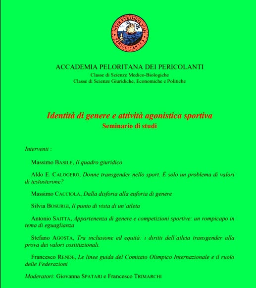 Lunedì 17 ottobre, a partire dalle ore 15, nella Sala dell’Accademia Peloritana dei Pericolanti si terrà un seminario di studi su un problema dei nostri tempi: Identità di genere e attività agonistica sportiva. Il seminario, organizzato congiuntamente dalla Classe di Scienze Giuridiche, Economiche e Politiche e dalla Classe di Scienze Medico-biologiche della Accademia Peloritana dei Pericolanti, intende approfondire un aspetto non più trascurabile della realtà sportiva Uno dei princìpi centrali dello sport agonistico, la parità dei gareggianti, induce l’ordinamento sportivo a organizzare competizioni distinte in dipendenza del genere dell’atleta sul presupposto della maggiore forza muscolare degli uomini rispetto alle donne. Il diffondersi della transessualità alimenta tuttavia l’aspirazione di atlete transgender a partecipare alle gare femminili; a queste gare, d’altra parte, aspirano a partecipare anche atlete iperandrogene. La duplice aspirazione non di rado incontra la resistenza delle rivali ad ammettere la partecipazione alle gare femminili di quelle atlete, assumendo che la loro maggiore prestanza fisica le avvantaggerebbe ingiustamente nella competizione. Gli organismi sportivi non hanno potuto eludere il problema, e hanno cominciato a fornire soluzioni tese a conciliare il rispetto della identità di genere delle atlete con il principio di parità agonistica. Nel seminario i professori di Diritto privato Massimo Basile e Francesco Rende, i costituzionalisti Antonio Saitta e Stefano Agosta, l’endocrinologo Aldo E. Calogero, lo psicanalista Massimo Cacciola, la campionessa olimpionica Silvia Bosurgi e la presidente regionale pallacanestro Maria Cristina Correnti discuteranno dal punto di vista giuridico e da quello medico degli orientamenti che vanno emergendo nel mondo dello sport sulla disciplina della ammissione alle gare femminili di atlete transgender e di atlete iperandrogene.