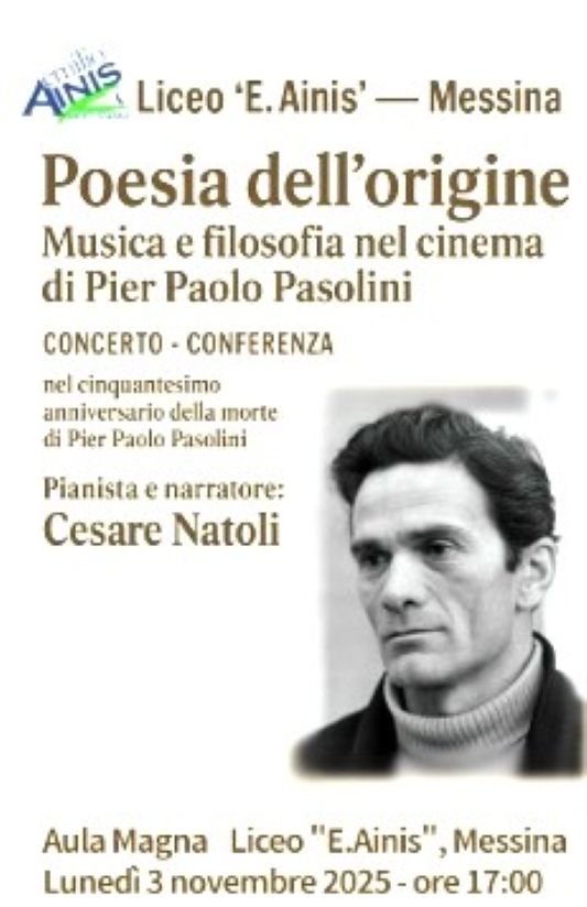 “Poesia dell’origine. Musica e filosofia nel cinema di Pier Paolo Pasolini” MESSINA – Nell’ambito delle celebrazioni per i novant’anni dalla fondazione del Liceo “Emilio Ainis” di Messina, si terrà lunedì 3 novembre 2025, alle ore 17:00, presso l’Aula Magna dell’Istituto, il concerto-conferenza “Poesia dell’origine. Musica e filosofia nel cinema di Pier Paolo Pasolini”, progetto artistico del pianista e musicologo messinese Cesare Natoli. L’evento, che si inserisce anche nelle celebrazioni per il cinquantesimo anniversario della morte di Pier Paolo Pasolini, scomparso il 2 novembre 1975, prevede la proiezione di brevi estratti dai principali film del regista, accompagnati da esecuzioni dal vivo al pianoforte dei brani utilizzati come colonna sonora. Il prof. Natoli analizzerà le principali riflessioni di Pasolini sulla musica e l’influenza che ebbe nella formazione e realizzazione delle sue opere. Verranno, inoltre, proposti brevi ascolti di brani orchestrali e repertori etnomusicologici presenti nei suoi lungometraggi, tratti dalla “Passione secondo San Matteo” di Bach, dai “Quartetti” e dal “Requiem” di Mozart. Il progetto artistico mira ad approfondire la complessa relazione di Pasolini con l’arte dei suoni, a partire da quanto dallo stesso espresso nel 1966: “Vorrei essere scrittore di musica”. Come scriveva Pasolini, “le immagini cinematografiche, riprese dalla realtà, e dunque identiche alla realtà, nel momento in cui vengono impresse su pellicola e proiettate su uno schermo, perdono la profondità reale, e ne assumono una illusoria”. È solo la fonte musicale, che “non è individuabile sullo schermo, e nasce da un ‘altrove’ fisico per sua natura ‘profondo’”, a sfondare “le immagini piatte […] dello schermo, aprendole sulle profondità confuse e senza confini della vita”. L’ingresso è libero e aperto a tutti.