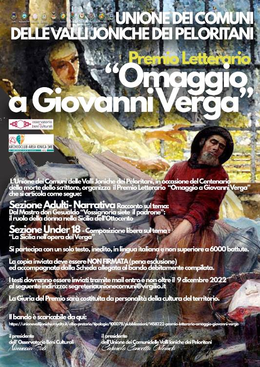 “Omaggio a Giovanni Verga” è il titolo del premio letterario istituito dall’Unione dei Comuni delle Valli Joniche dei Peloritani e ideato dal suo Osservatorio per i Beni Culturali. In occasione del centenario della morte dello scrittore catanese, l’Osservatorio ha voluto così coinvolgere appassionati e studenti invitandoli ad una riflessione sull’attualità della sua opera con un concorso che si chiuderà il 9 dicembre prossimo.