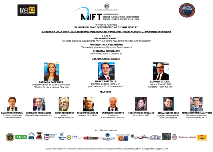 “Negli ultimi anni molti fattori hanno contribuito ad accrescere la consapevolezza di quanto sia importante comunicare la scienza. I media hanno scoperto che anche la ricerca attira l’attenzione del grande pubblico. Il giornalismo scientifico ha quindi acquisito sempre più interesse, specie per i molteplici argomenti diventati d’attualità, dalla pandemia al bosone di Higgs, che necessitano di un approfondimento maggiore e di una cultura scientifica. Proprio per questo abbiamo deciso di realizzare questo workshop, che sarà propedeutico alla possibile creazione di un Corso di alta formazione e in seguito di un master in giornalismo scientifico, che sarà il primo in tutto il Sud Italia”. A dirlo il prof Salvatore Magazù decano di Fisica al Mift dell’Ateneo di Messina, che ha organizzato oggi insieme alla società Byto del giornalista e portavoce parlamentare Antonio Ivan Bellantonie al giornalista Gianluca Rossellini un workshop di eccellenza dal titolo “Giornalismo Scientifico ai giorni nostri”, che ha visto la partecipazione di importanti relatori, tra cui Marco Frittella, direttore Editoriale Rai Libri e già conduttore Tg1 e “Unomattina”; Barbara Carfagna, Conduttrice Tg1 e Autrice-Conduttrice della trasmissione “Codice: la vita è digitale” su Rai Uno; Romolo Sticchi, Inviato Speciale Tg3 e curatore del format “Pixel” su Rai Tre.