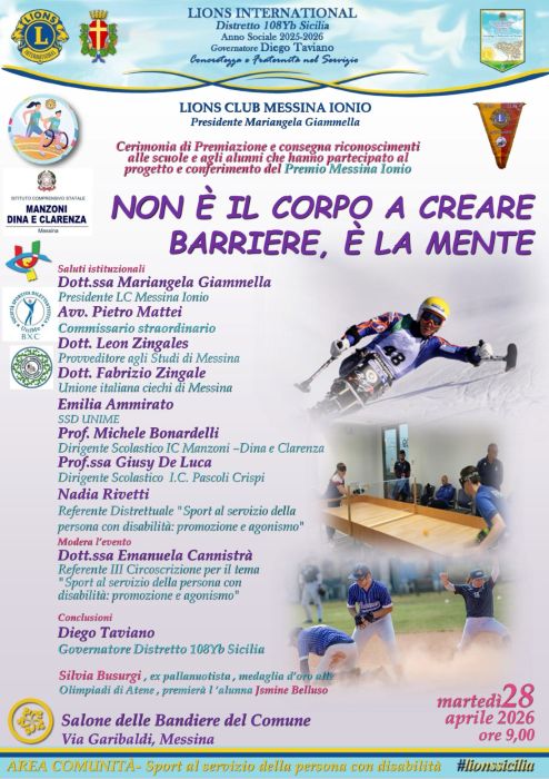 Non è il corpo a creare barriere, è la mente: questa l’idea che deve spingerci ad impegnarci per promuovere e consolidare una società davvero inclusiva. Ed è proprio in questa prospettiva, infatti, che si svolgerà martedì 28 alle 9:00 presso il salone delle bandiere del comune di Messina la cerimonia conclusiva del Service distrettuale Lions “Sport al servizio della persona con disabilità: promozione e agonismo”.