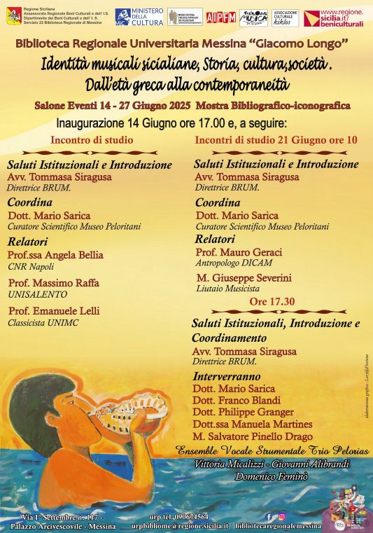 In sinergia con l’ ”Associazione Kiklos” e l’Istituto culturale “Museo Cultura e Musica Popolare dei Peloritani” , la Biblioteca Regionale Universitaria “Giacomo Longo” ha approntato un ricco palinsesto che include, oltre che all’Esposizione di preziosi volumi estrapolati dai Fondi d’Istituto e di foto tematiche messe a disposizione per l’occasione dall’Artista Dott.ssa Manuela Martines, tre Incontri tematici di grande interesse (14 e 21 giugno) con la partecipazione di Relatori di levatura e, in chiusura, un Momento performativo con esecuzioni di brani in lingua dialettale siciliana da parte di Artisti contemporanei.