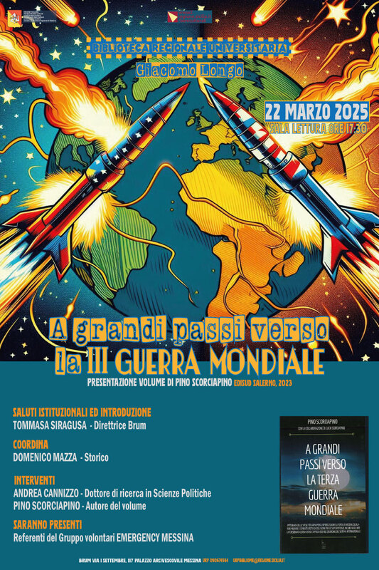 Si terrà sabato 22 marzo 2025 alle ore 17.30, presso la Sala Lettura della Biblioteca Regionale Universitaria di Messina, la presentazione del volume: “ A grandi passi verso la terza guerra mondiale ”, di Pino Scorciapino, pubblicato dalla casa editrice EdiSud Salerno, nel 2023.