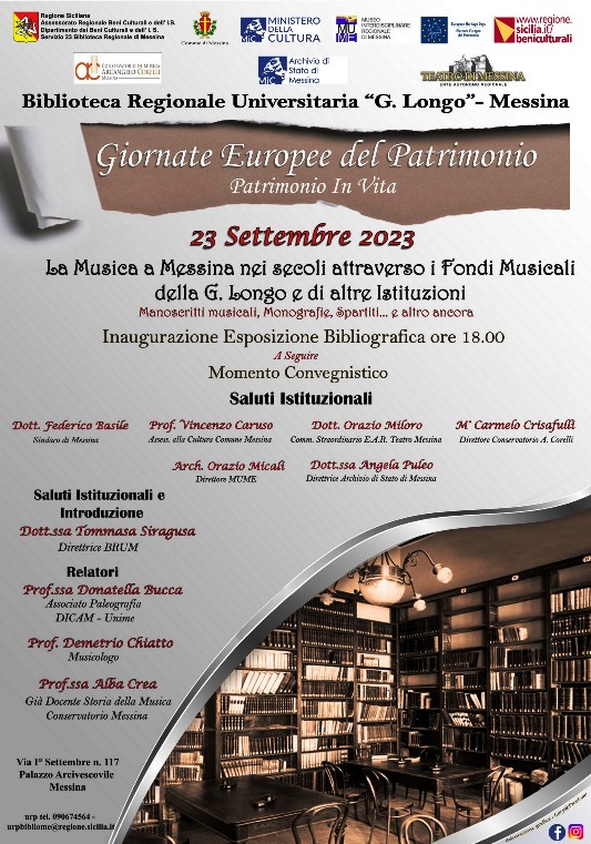 In occasione delle Giornate Europee del Patrimonio, edizione 2023, indette dal M.I.C., con il tema “Patrimonio In Vita”, di concerto con Enti e Associazioni culturali territoriali e avvalendosi dell’apporto di esperti e del ricco posseduto sulla tematica, la Biblioteca Regionale Universitaria “Giacomo Longo” organizza l’evento “La Musica a Messina nei secoli attraverso i Fondi Musicali della G. Longo e di altre Istituzioni. Manoscritti musicali, Monografie, Spartiti… e altro ancora”.
