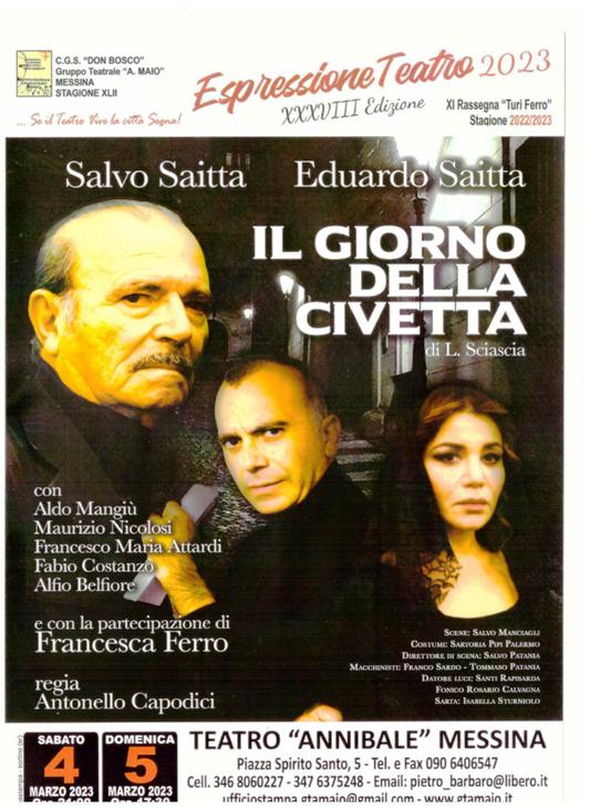 Salvo Saitta, uno dei decani della scena siciliana e nazionale, è don Mariano, spietato padrino mafioso; Eduardo Saitta, invece, è il capitano dei carabinieri Bellodi, che indaga su un efferato omicidio.