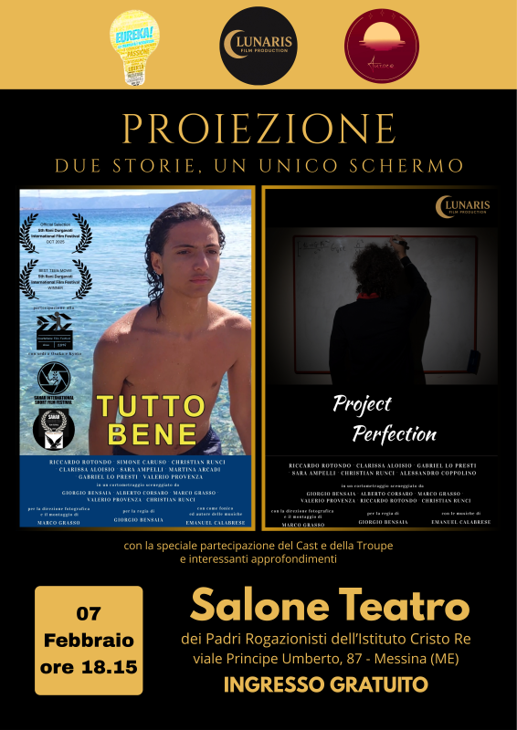 Scriviamo a Voi rinomate redazioni nella speranza che possiate dedicarci uno spazio all’interno dei vostri quotidiani fisici e/o online, per poter far conoscere a più persone questo nostro successo e per sensibilizzare riguardo i temi e la trama di Progetto Perfezione, divulgando anche la notizia della sua première gratuita che si terrà il prossimo Sabato 7 Febbraio 2026, a partire dalle ore 18.15, presso il Salone Teatro dei Padri Rogazionisti dell’Istituto Cristo Re di Messina, in viale Principe Umberto n. 87; cui seguirà, dopo un lungo auspicato percorso festivaliero, la pubblicazione su varie piattaforme online, che lo renderanno visibile liberamente e imminente.
