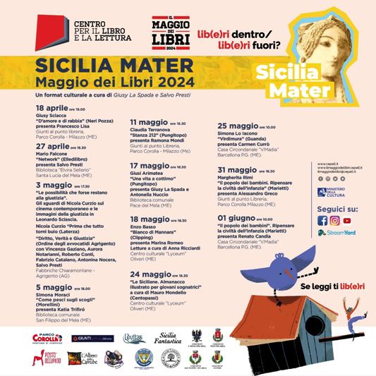 la casa circondariale di Barcellona P.G (Me), la libreria Giunti al Punto di Parco Corolla, le biblioteche dei Comuni di Santa Lucia del Mela, San Filippo del Mela, Pace del Mela, il centro culturale “Lyceum” di Oliveri (Me) e, in occasione di un evento speciale dedicato a: