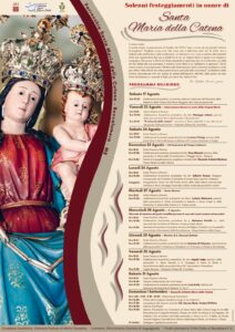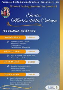 Si sono aperti a Roccalumera ieri i festeggiamenti in onore di Santa Maria della Catena. L’inizio del novenario cade proprio di 23 agosto, giorno in cui si fa memoria del miracolo avvenuto in Palermo sotto il sovrano Martino. Tre condannati ingiustamente attendono all’interno della chiesa che arrivi l’ora del supplizio…invocano l’intercessione della Madonna e prontamente le catene si sciolgono. Da quel prodigioso miracoli la Madonna venerata come santa Maria del porto venne ricordata come Santa Maria della Catena.
